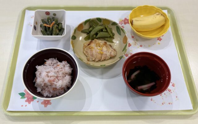 ほんのり桜色のごはんに、ゆず味噌の香ばしさがよく合う鶏肉、シャキッとしたいんげんのサラダ、そして優しい味わいのすまし汁。どれも春の息吹を感じられる、心温まる組み合わせです。
